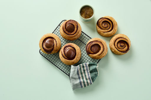 Tages direkte fra fryser og bages i snegleringe med diameter 100 mm 22-24 min. i varmluftsovn ved 190°C (forvarmet). Produkterne afkøles i 15 min. inden dekoration. Bagte produkter bør spises indenfor 24 timer efter bagning.