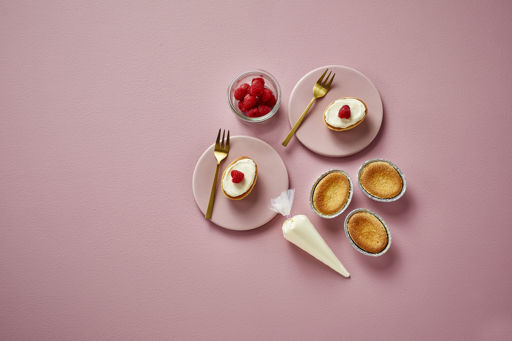 Tages direkte fra frys og afbages i en forvarmet ovn. Bages i 18 min. i varmluftsovn ved 190°C. Produkterne afkøles i 15 min. inden evt. dekorering