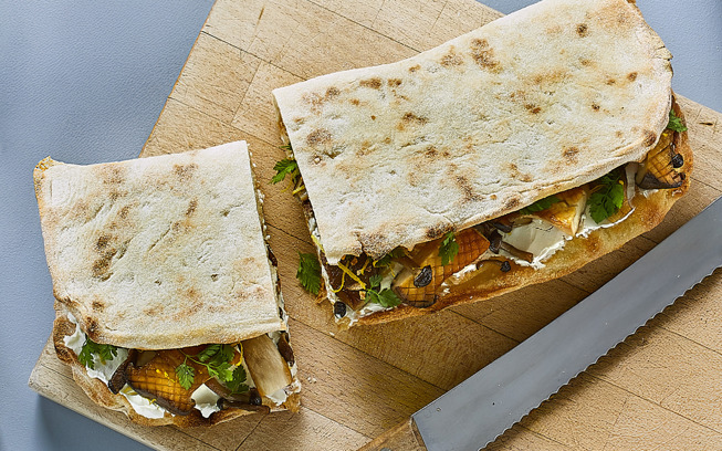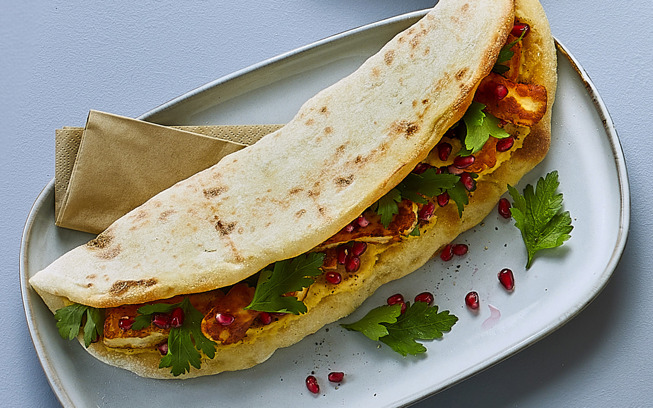 Pinsa sandwich med stegt halloumi, hummus og granatæble