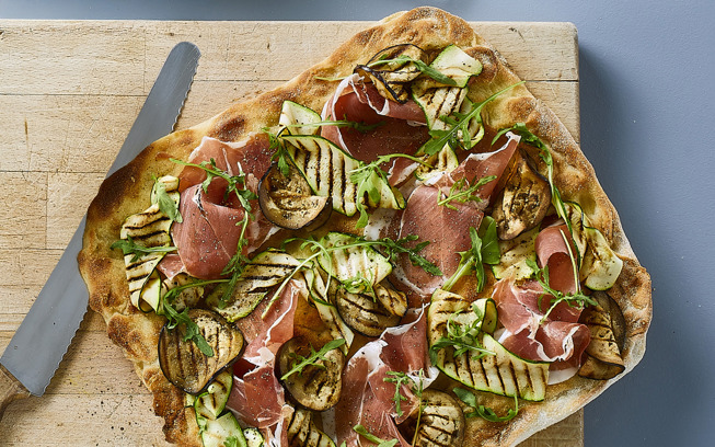 Pinsabrød parmaskinke, grillet squash og aubergine