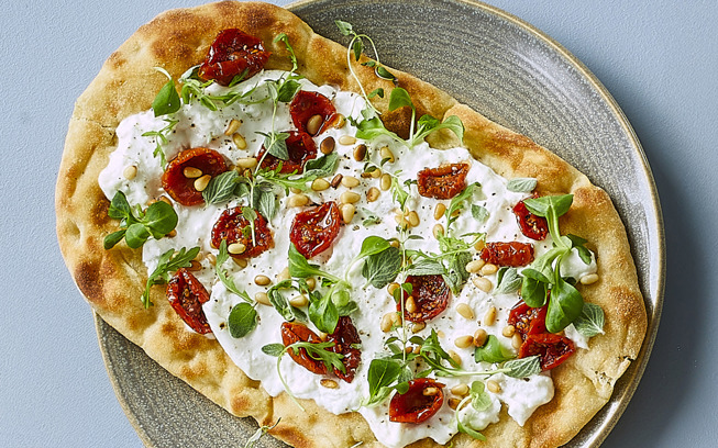 Pinsa med burrata og semitørrede tomater