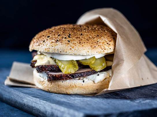 ØKO-burgerbollen har sorte sesam på toppen og det var dét, der inspirerede mig til at gå “asian style” på den her. Den “asiatiske frikadelle” bidrager med fedme og karamelliseret smag, mens de øvrige elementer giver oplevelsen af dumpling ind i burgeren.