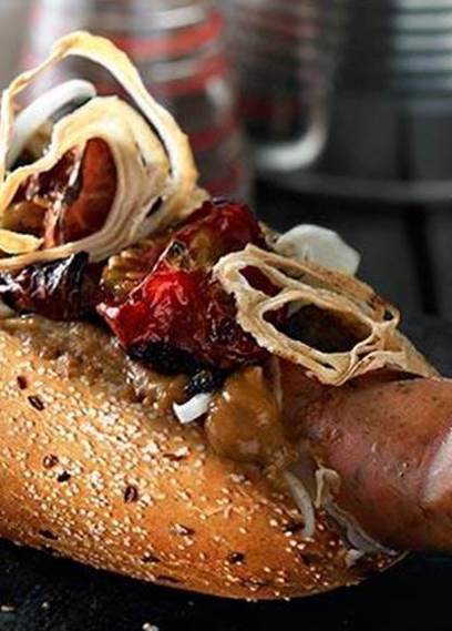 Denne franske variant er med kartoffelaioli, rabarberkompot, ristede portobellosvampe, fennikelcrudite og sprøde løgringe.